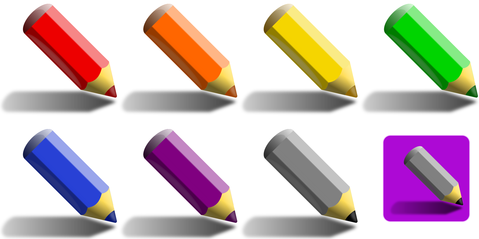 7 color pencils: red, orange, yellow, green, blue, violet, black. Images fit into squares. Pencils drop shadows and have semi-transparent reflexes, which change color depending on background.