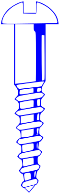 A side view in blue of a common wood screw, i.e. a screw where the threads taper to a point at the end. There is also available in this collection an image of a machine screw, which is flat at the end and the threads are continuous and identical from start to finish.