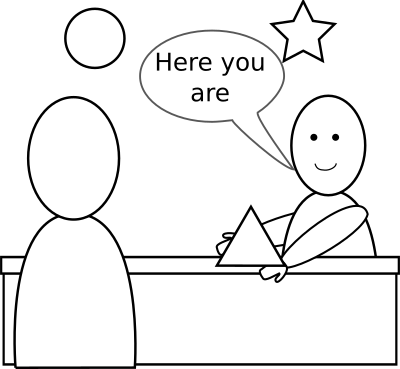 A shopkeeper figure hands a customer a triangle he selected from a choice of a triangle, a circle, and a star. A speech bubble includes the English text, "Here you are".