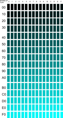 Shades of the color Cyan from 0 to 255