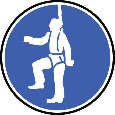 A round blue sign telling people to use a fall arresting device.