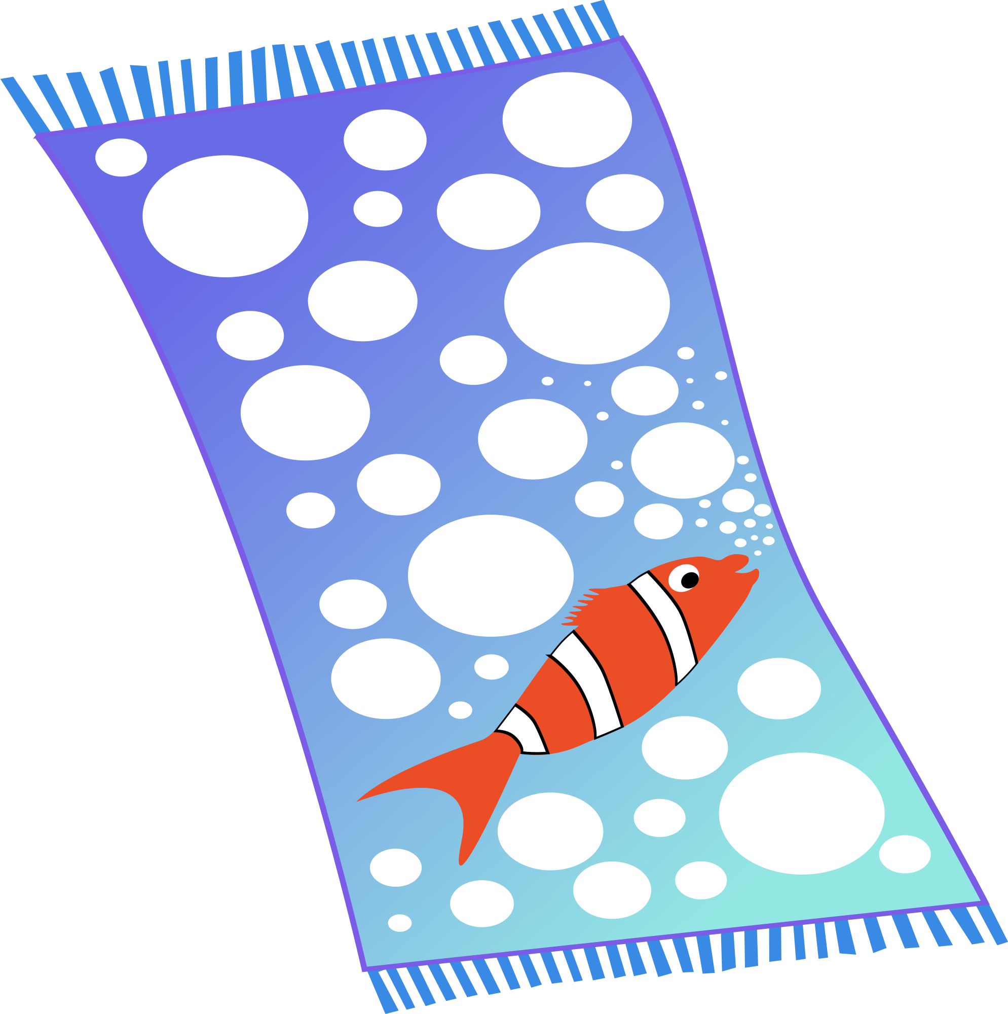 Towel blue with white bubbles and red fish with white strips - Serviette de bain bleue avec bulles blanches et poisson rouge avec bandes blanches - Handtuch blau mit weißen Bläschen und roter Fisch mit weißen Streifen - Asciugamano blu con bolle bianche e pesce rosso con strisce bianche