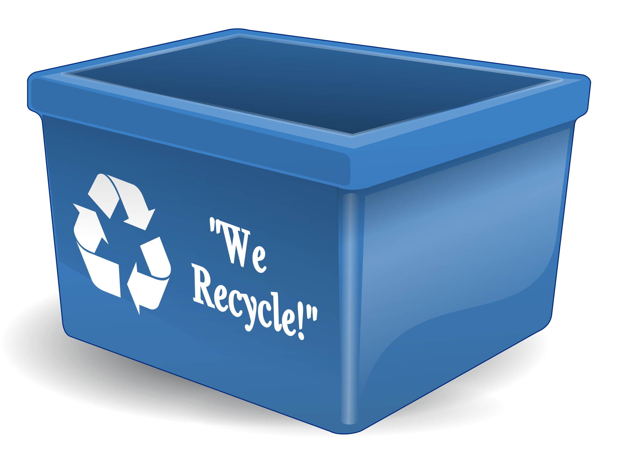 An empty blue recycling bin (blue box) drawn in 3-D perspective, with a recycling symbol and the words "We Recycle" on the side.