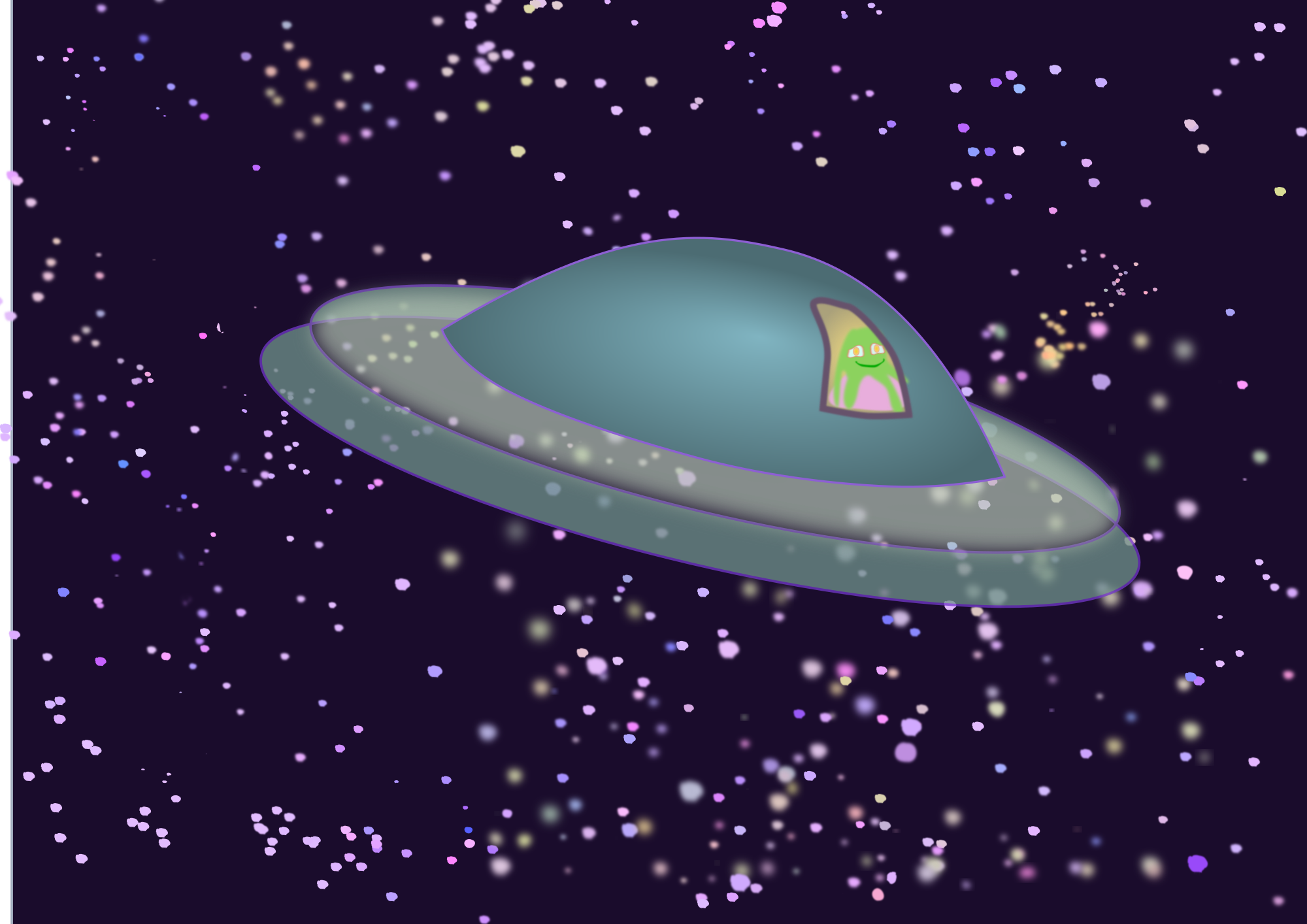 An alien in a UFO looking out over stars.
