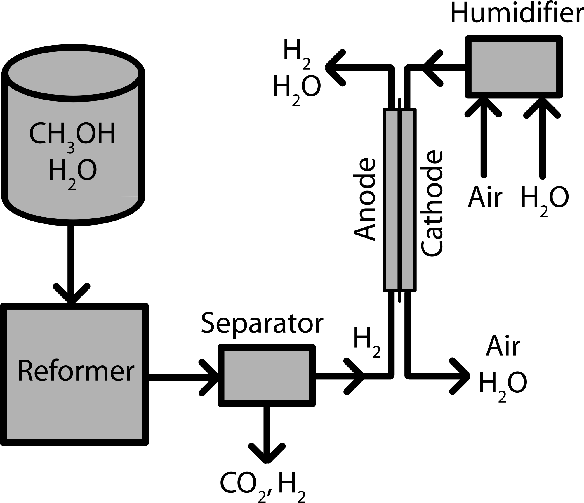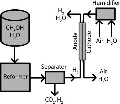 An indirect methanol fuel cell system. Methanol is reformed to hydrogen and then supplied to the fuel cell.