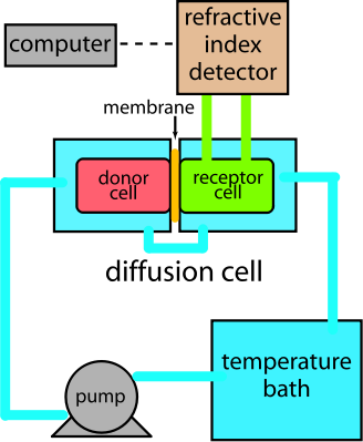 An experimental apparatus to measure the diffusion or permeability of a compound through a membrane using a refractive index sensor.