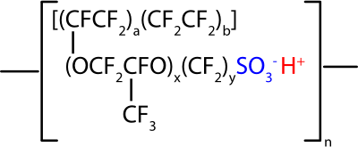 The chemical structure of Nafion membrane, commonly used in fuel cells.