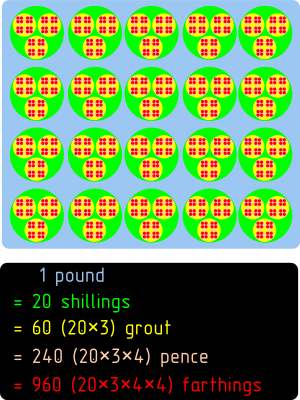 = 960 (20 × 3 × 4 × 4) farthings