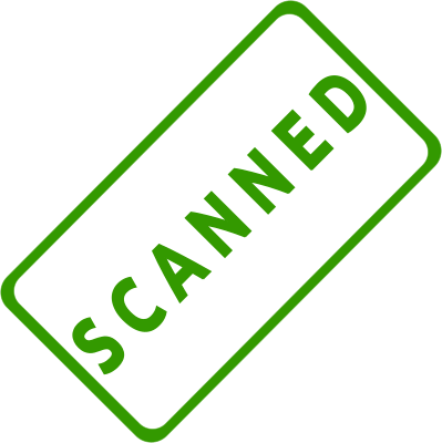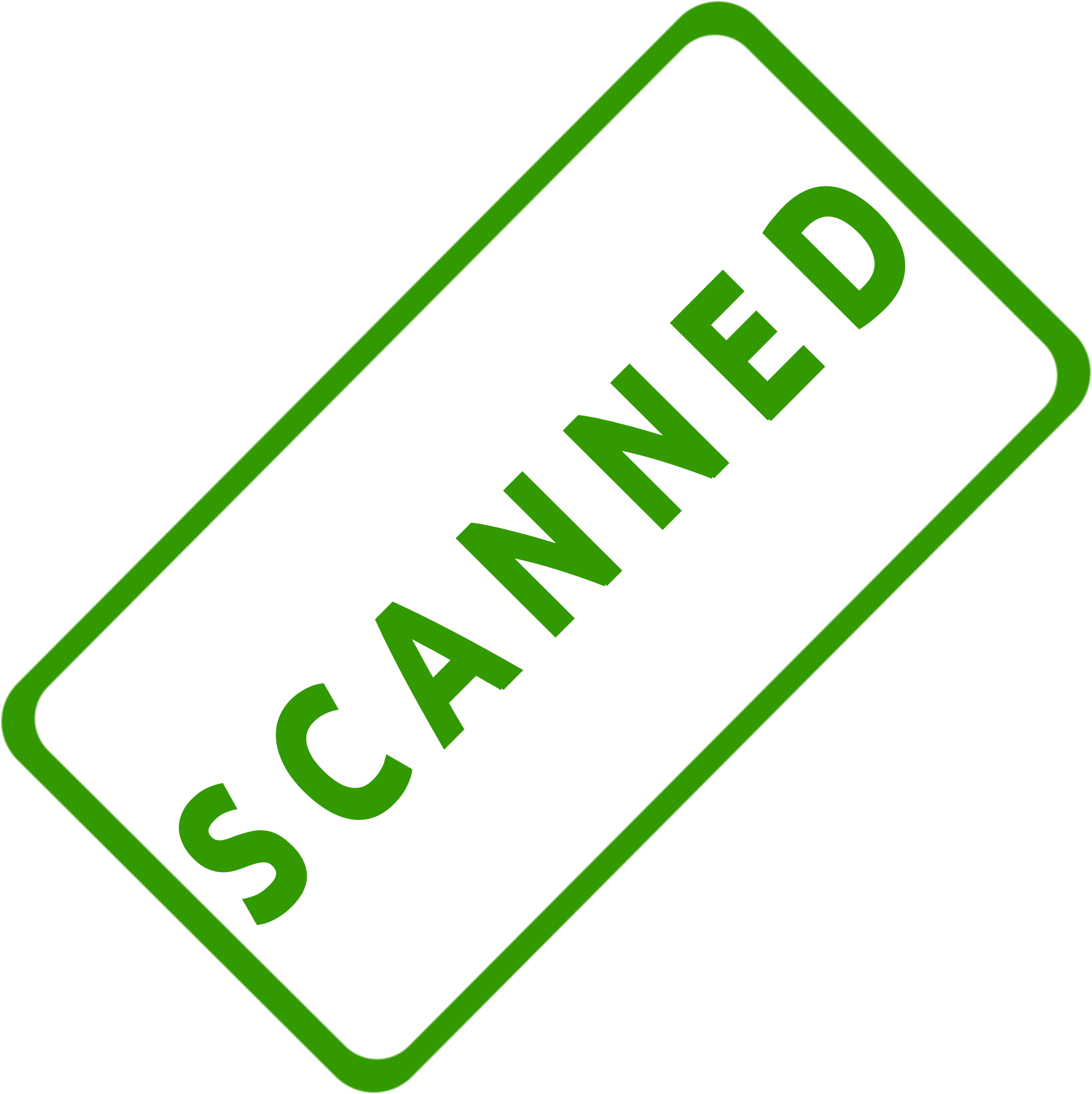A slanted solid green business stamp, with the words, "Scanned." Created with Inkscape.