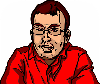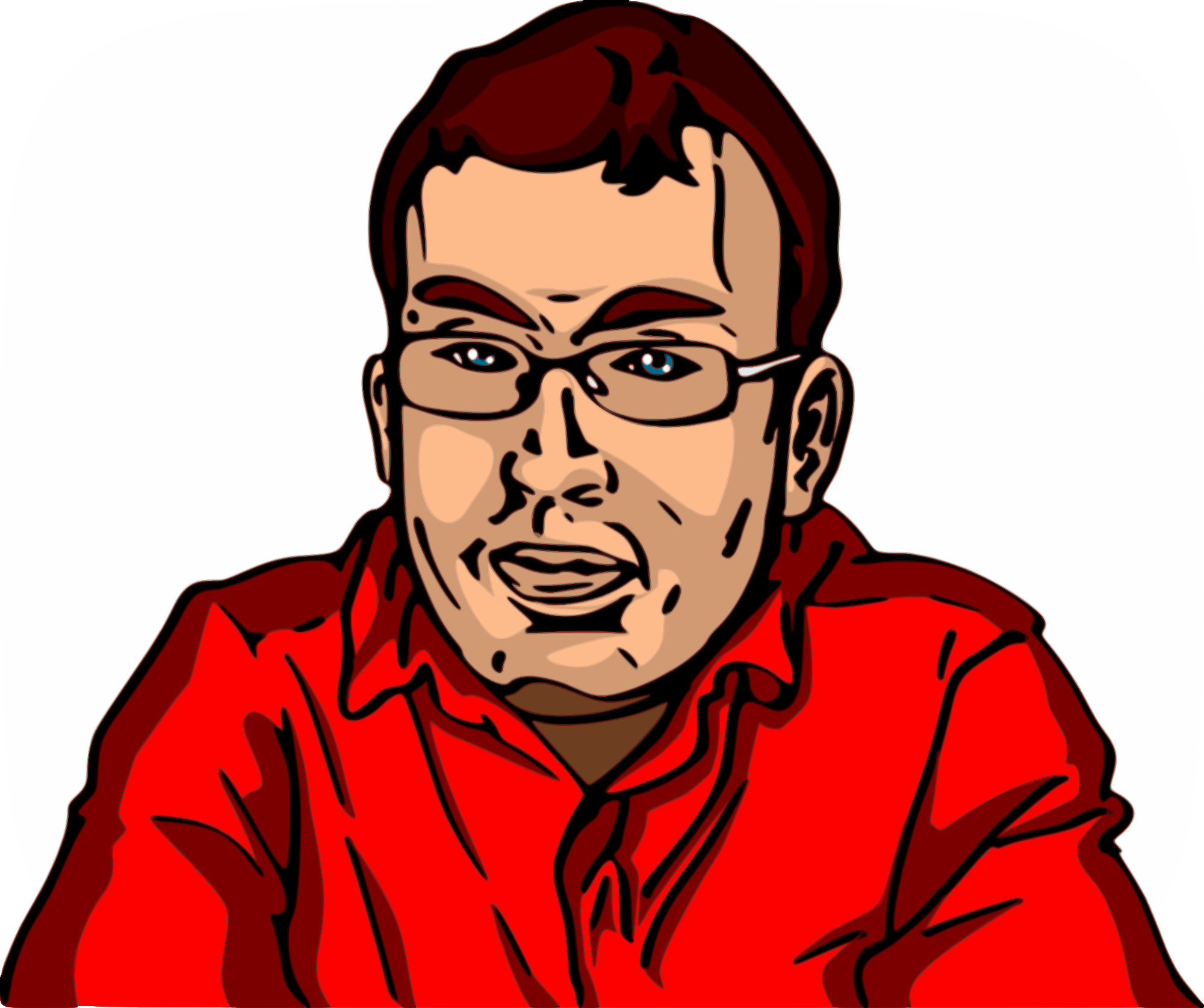 A young smiling man with glasses and a red shirt.