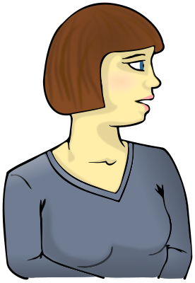 A white adult female bodied person with brown hair and blue eyes. Wearing a long sleeved blue top. Looking to the left.