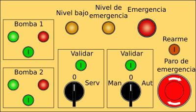 A simple industrial panel with buttons, selectors, and lights. Captions are in spanish