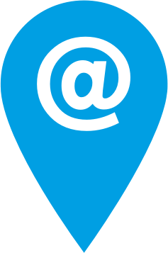 A blue icon shaped like a location pointer with a @ symbol. This blue icon could be used as an email icon or the @ symbol replaced with another symbol.