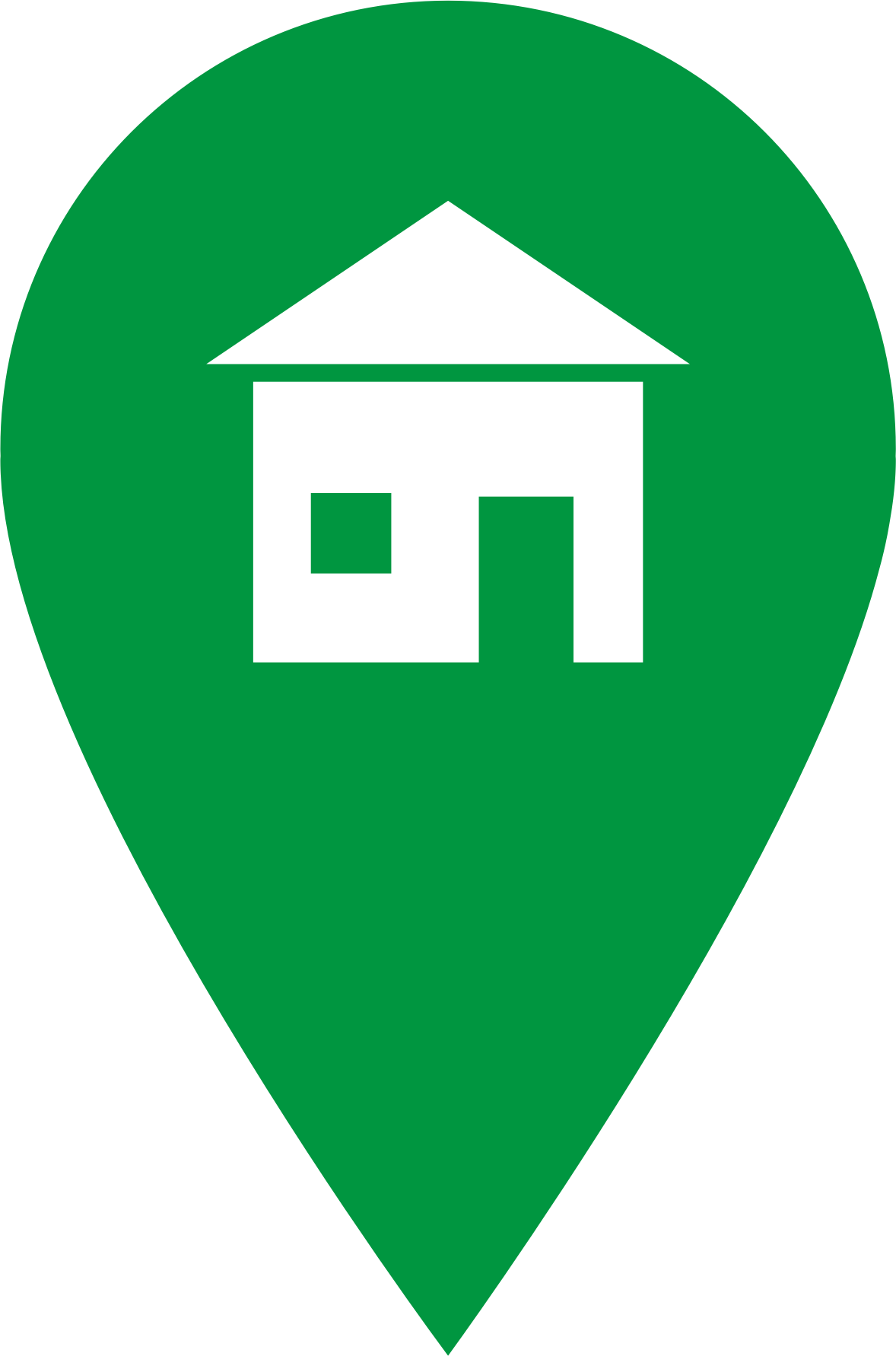 A green icon shaped like a location pointer, with a house symbol. The icon could be used as a location pointer, a home icon or an icon with a different symbol.