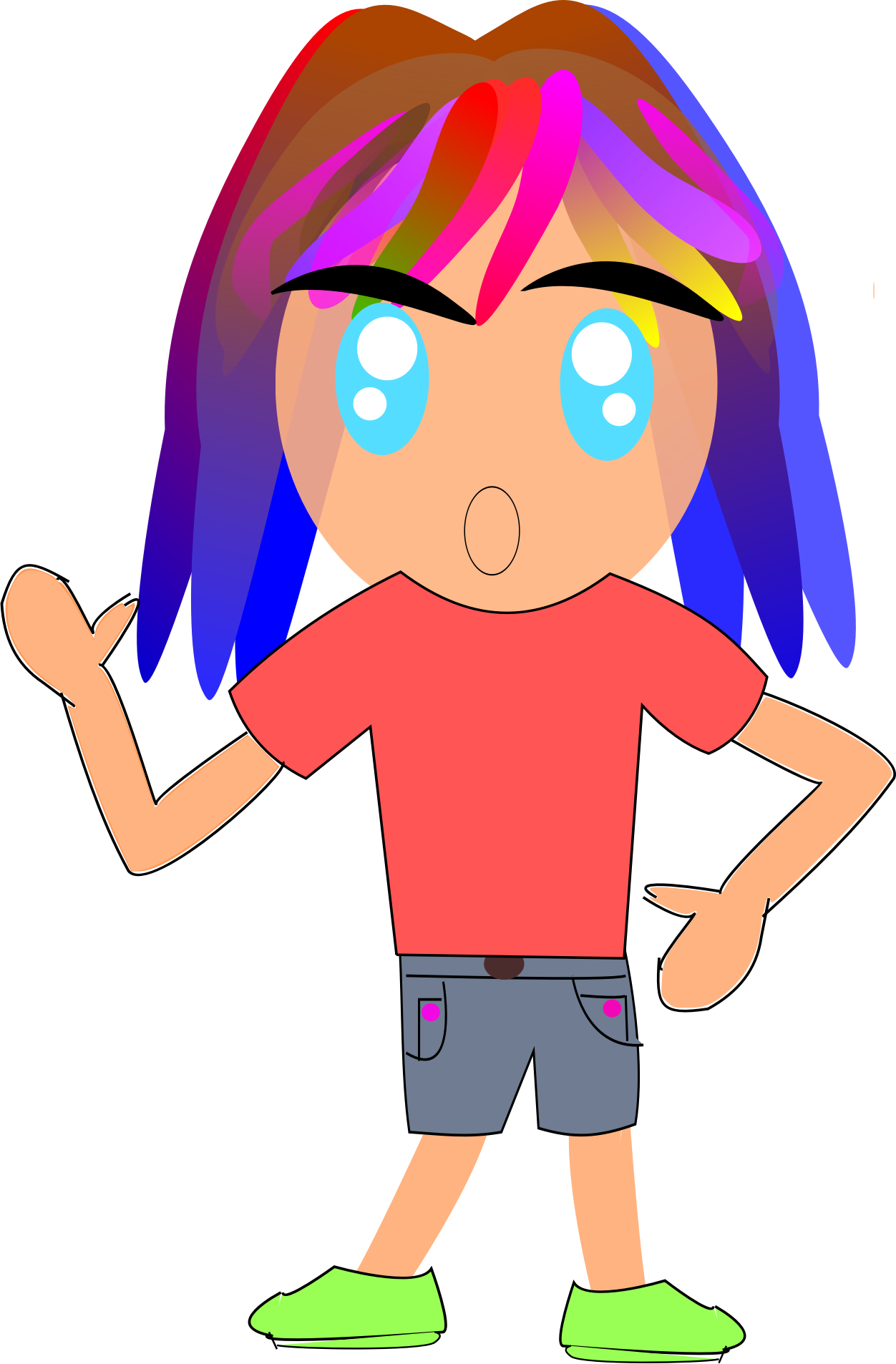 A pink and blue haired kid with a pink shirt and green shoes in asian avatar style.