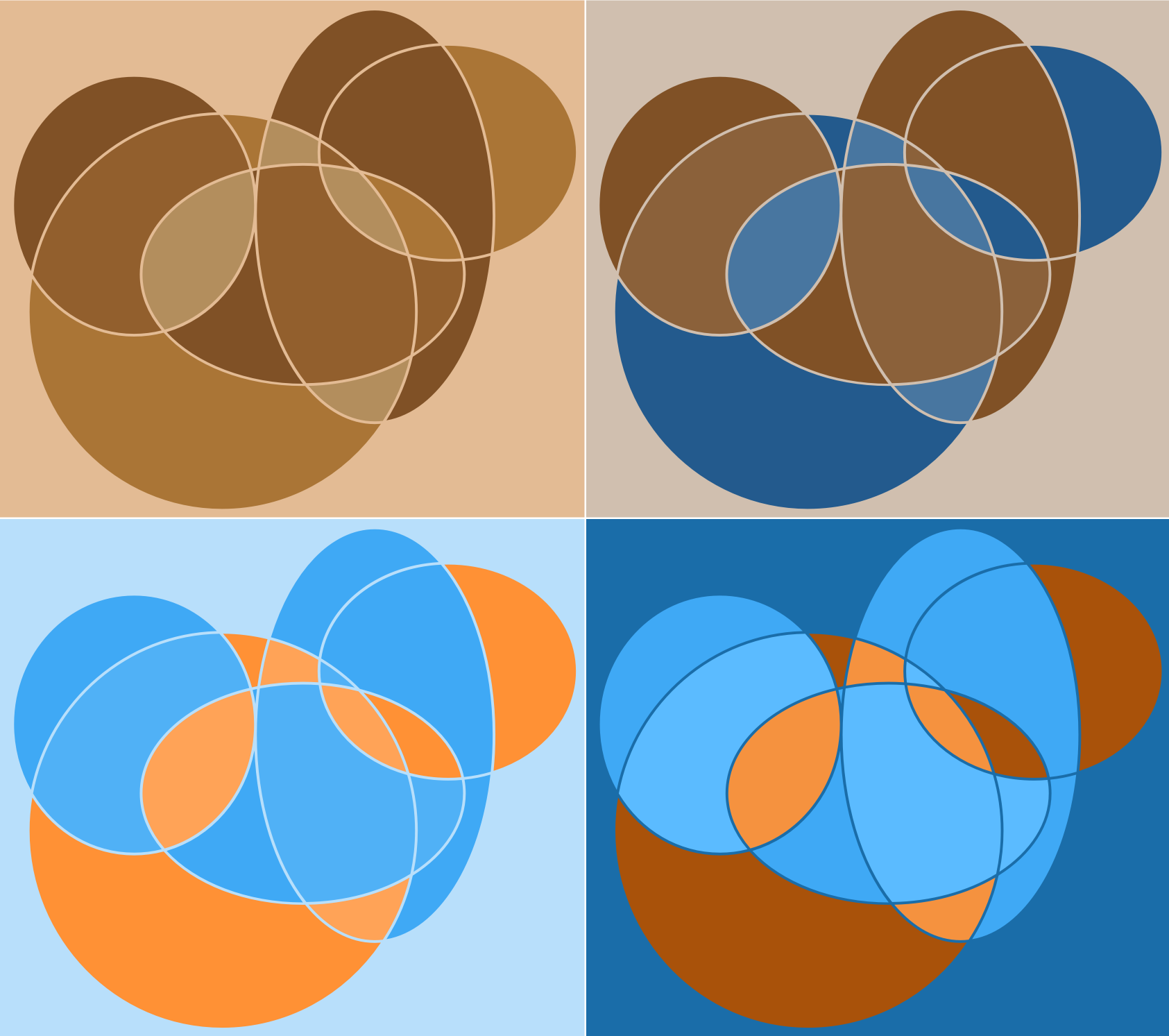 A series of four compositions in orange blue and brown using ovals and circles