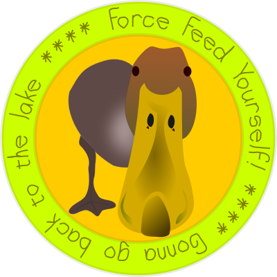 This is a simple patch with a duck on it. The duck is requesting foie gras eaters to feed force themselves. The duck also expresses his/her wish to go back to the lake as any worthy created creature may freely choose to do whenever they wish to do so.