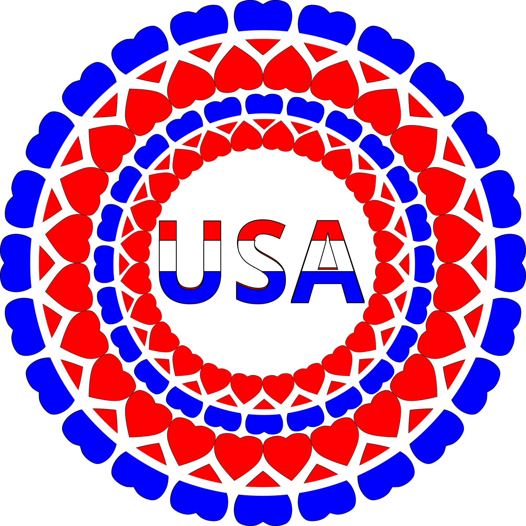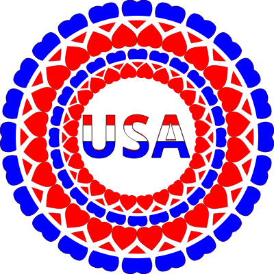Sticker or button for 4th of July in the United States, circles of hearts surrounding "USA".