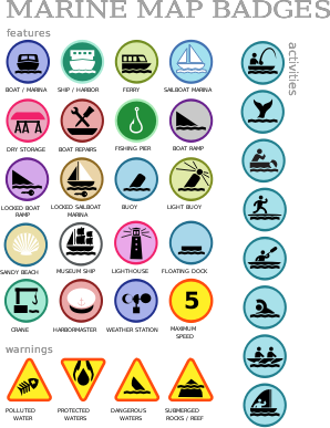 A set of badges for decorating maps of harbor areas to make it easier to find information relevant to boaters.
