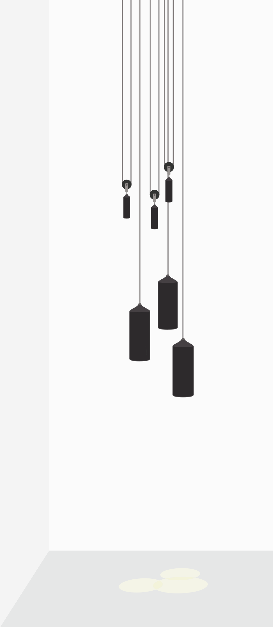 Three lights with a pulley system hanging in a room.
