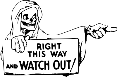 Ghost with a sign saying "Right this way and watch out".