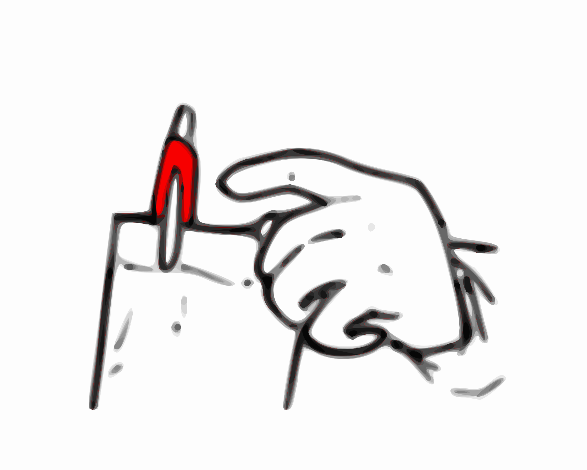 This is a drawing of a hand grabbing a red pen. This was made in GNU/Linux using all the wonderful tools, like Inkscape, MyPaint, and Pinta.