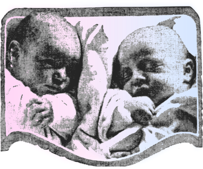 I suppose the colour gradation between these two babies could symbolize gender roles in society (even more so that pink used to be for boys, and blue used to be for girls!) and symbolical of being born or something.