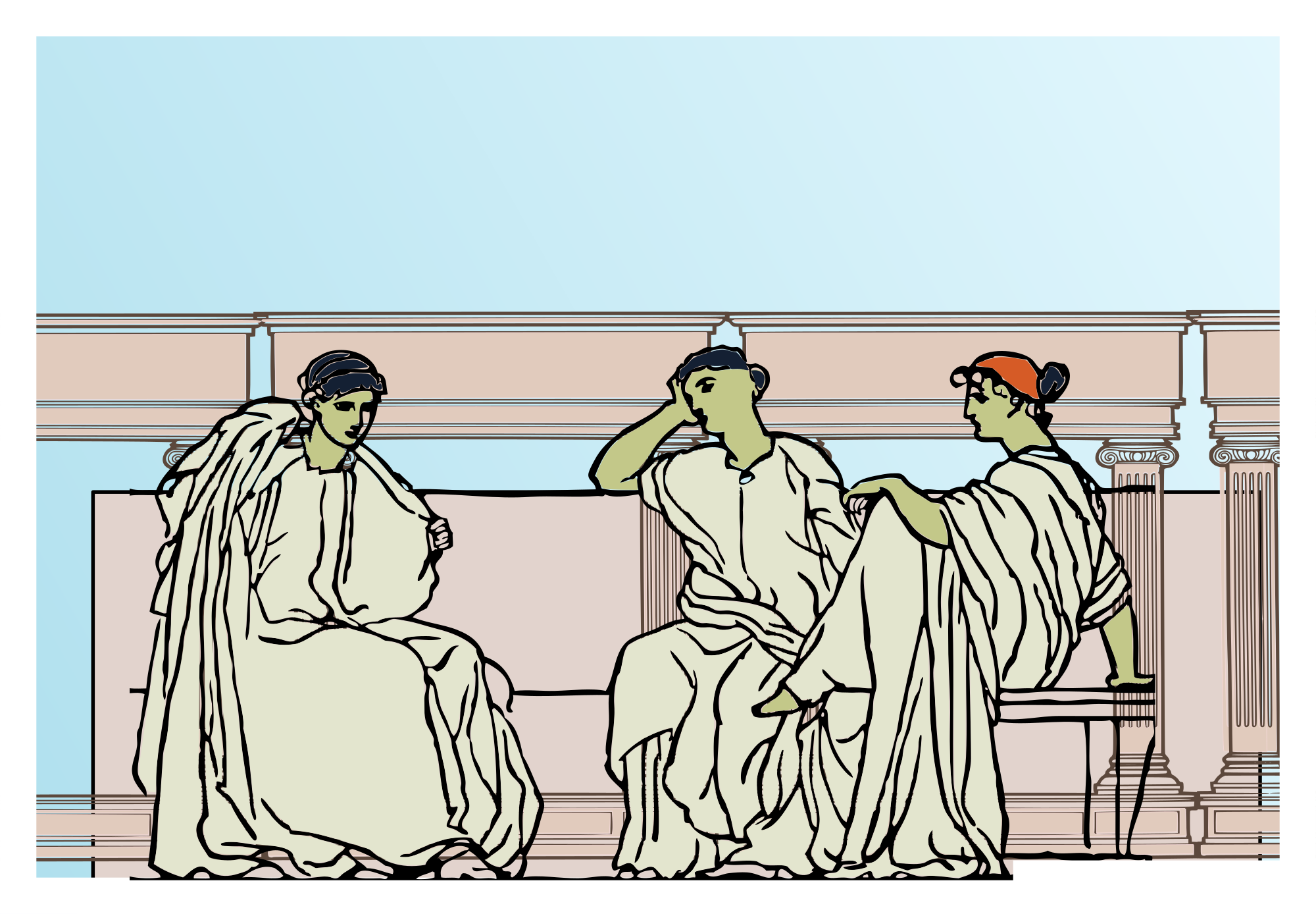 Three women in flowing robes sit in from of Roman arches. It's a remix of http://openclipart.org/detail/5970/roman-relief-3-by-johnny_automatic2 and http://openclipart.org/detail/172127/simple-roman-frame-by-j4p4n-172127