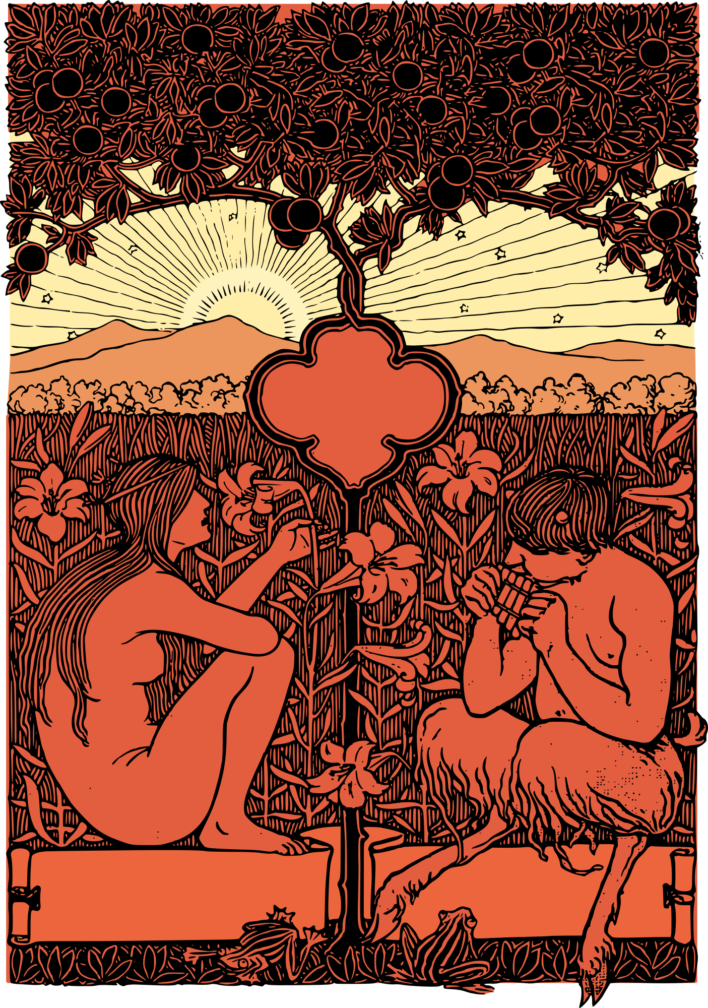 - Print beauty flute fruit hippie life music naked nature nude peace satyr sunrise sunset tree