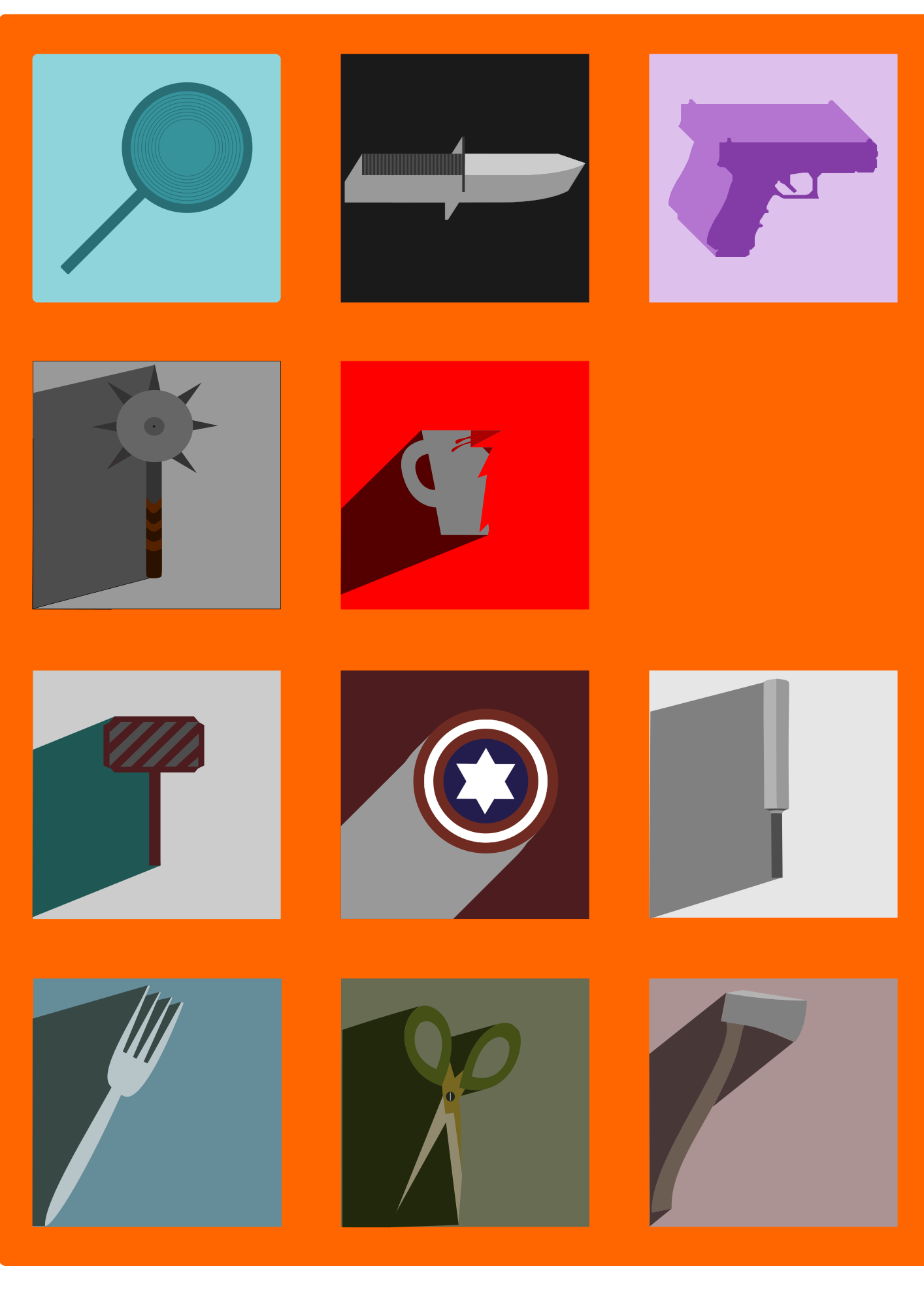 - axe broken mug cricket bat fork frying pan gun hammer knife lightsaber long shadow mace scissors shadow shield weapon weapons
