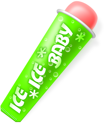 A red shaded popsicle in a green packaging with the words: "ice ice baby" on it.