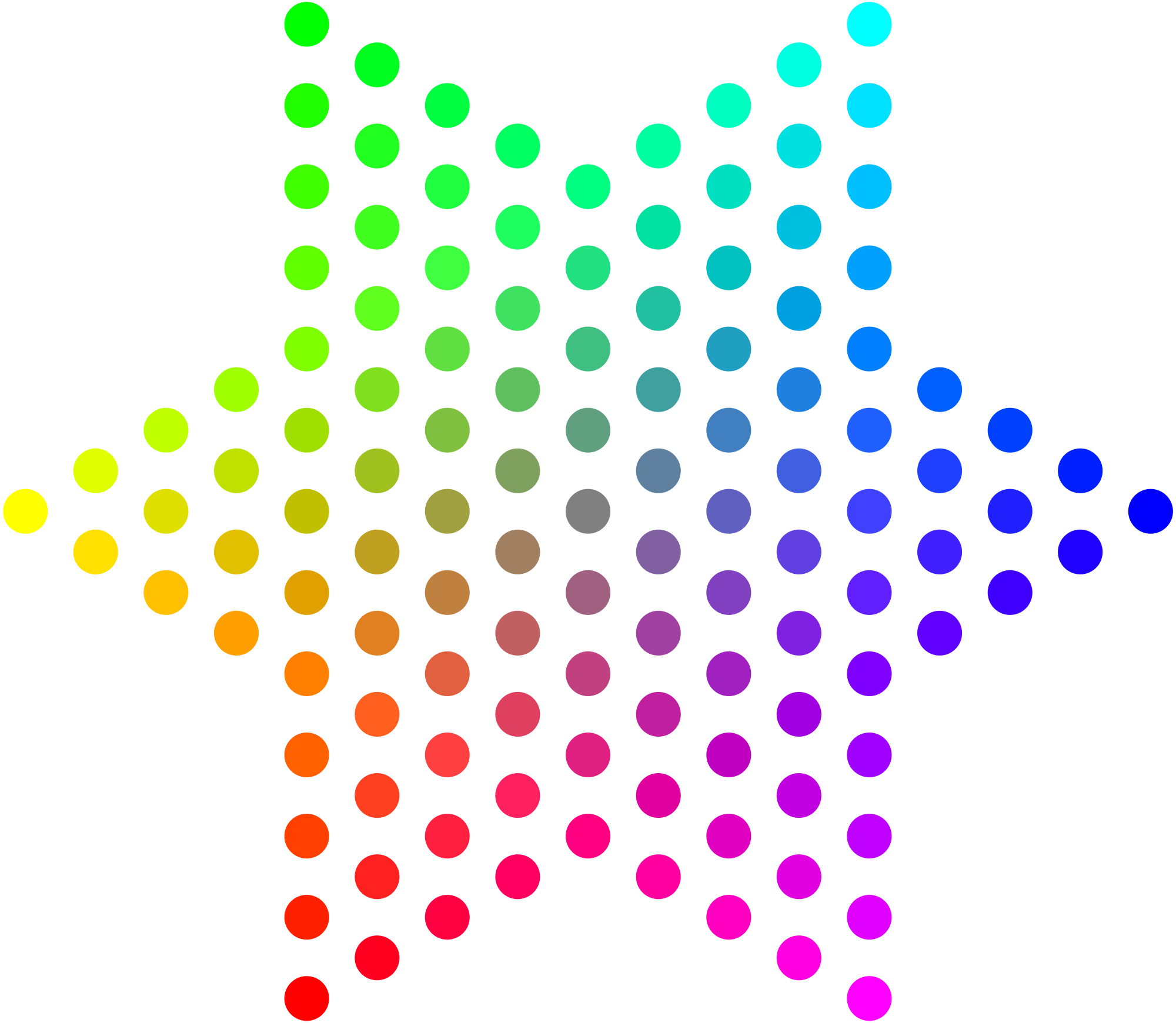 Grid of dots arranged in a hexagram to demonstrate RGB (red-green-blue) color mixing