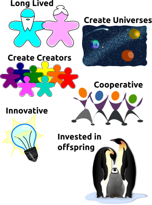 traits likely to be possessed by evolved gods in certain, sufficiently limitless multiverses. Includes: "Space sketched" by mi_brami, "dancing-people" by netalloy, "Pinguin Familie" by Mogwai, and "Light bulb" by nicubunu