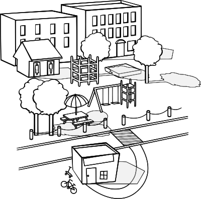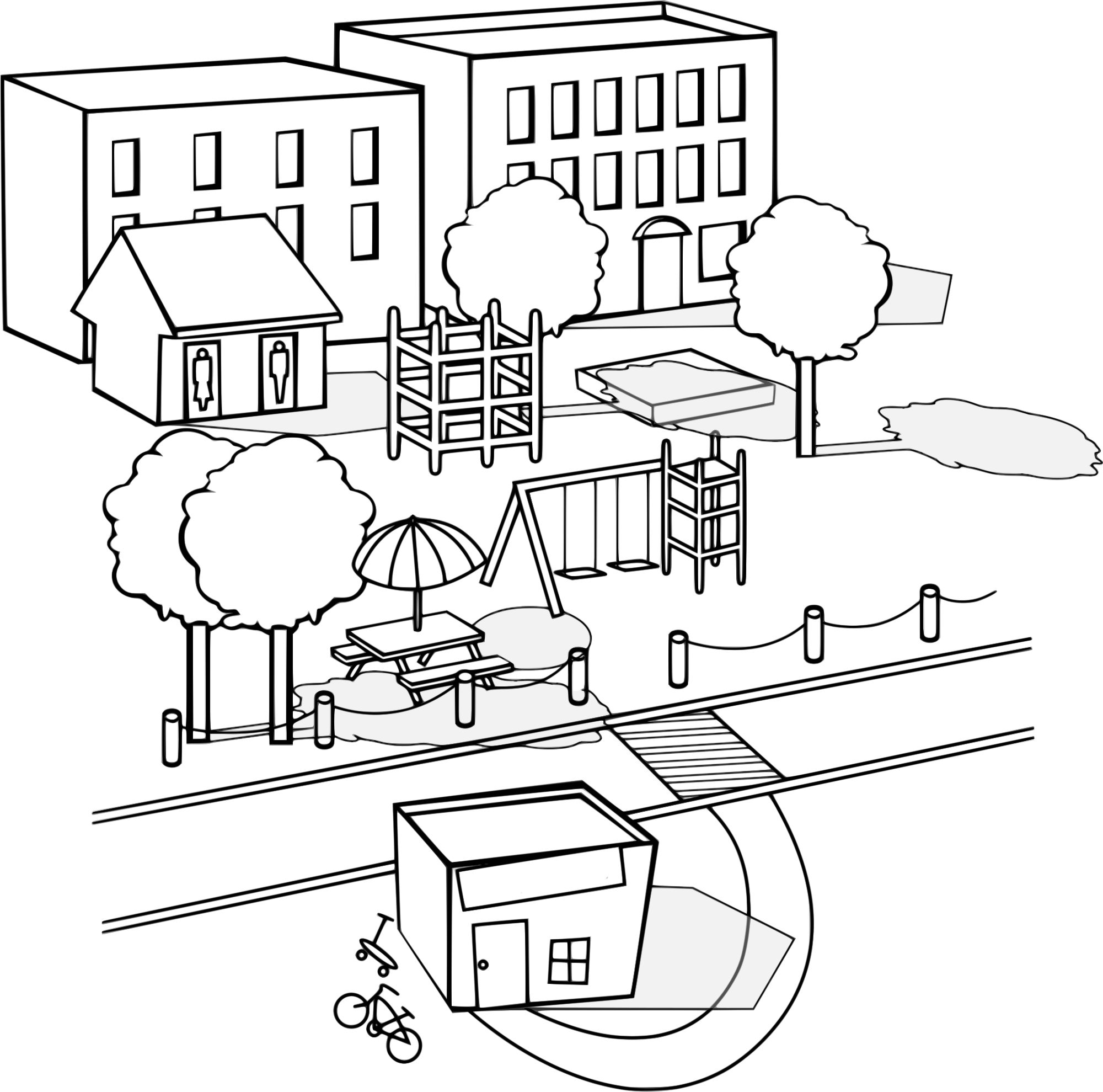A quaint little neighborhood with a clubhouse, some bikes, and some houses. Also a fun little park. (This was an official US Government [EPA] produced image officially released by the institution as part of their kid's outreach program, so it is public domain.)
