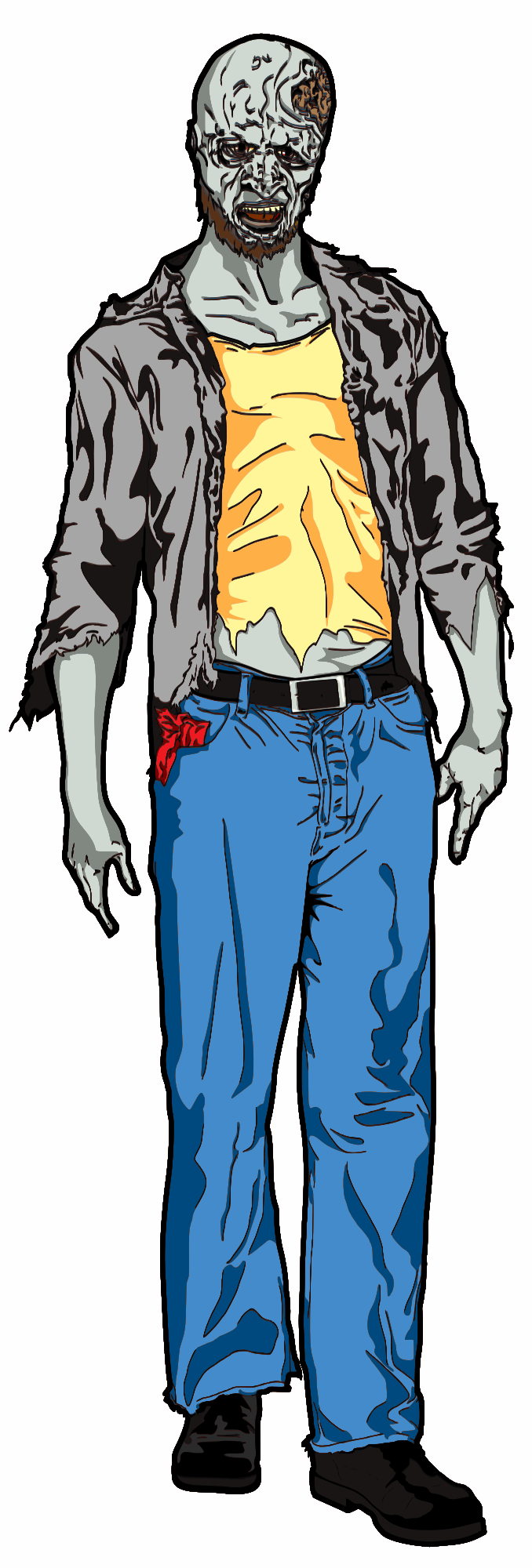 A full body male zombe with a partially exposed brain.