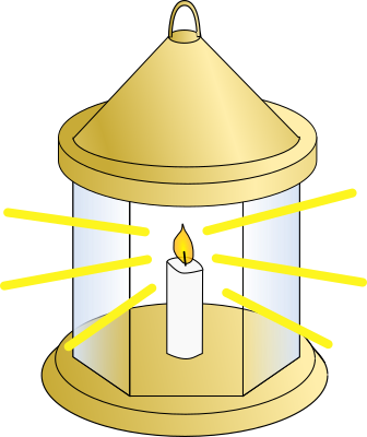 A lantern with a candle in the centre and beams of light shining out of it
