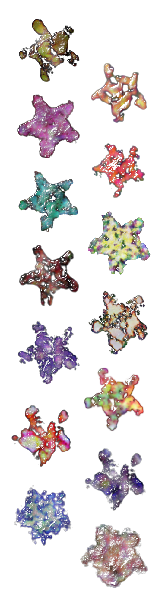 A set of cracked fractal textures with a translucescent and sometimes iridescent waxy feel. Colorizable (using HSL dialog is better), modifiable.