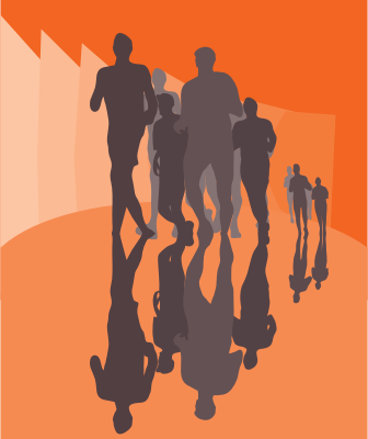 group of running mans, silhouette, with reflection, over orange background.