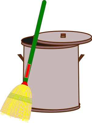 A bin and a broom. / Uma caixa e uma vassoura.