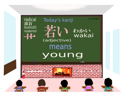 a kanji which is read as "wakai" and means "young" and includes a radical or bushu called "kusakanmuri".