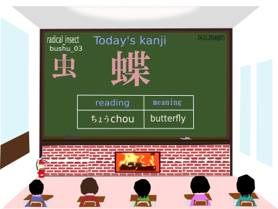 a kanji which is read as "chou" and means "butterfly" and includes a radical or bushu called "mushihen"