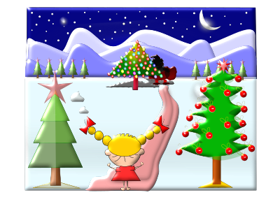 Christmas card scene with a girl looking towards a christmas tree.