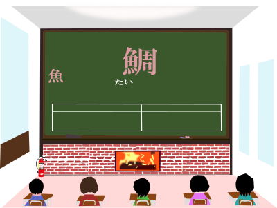 a kanji which is read as "tai" and means "sea bream" and has a radical or bushu called "uohen" meaning "fish".
