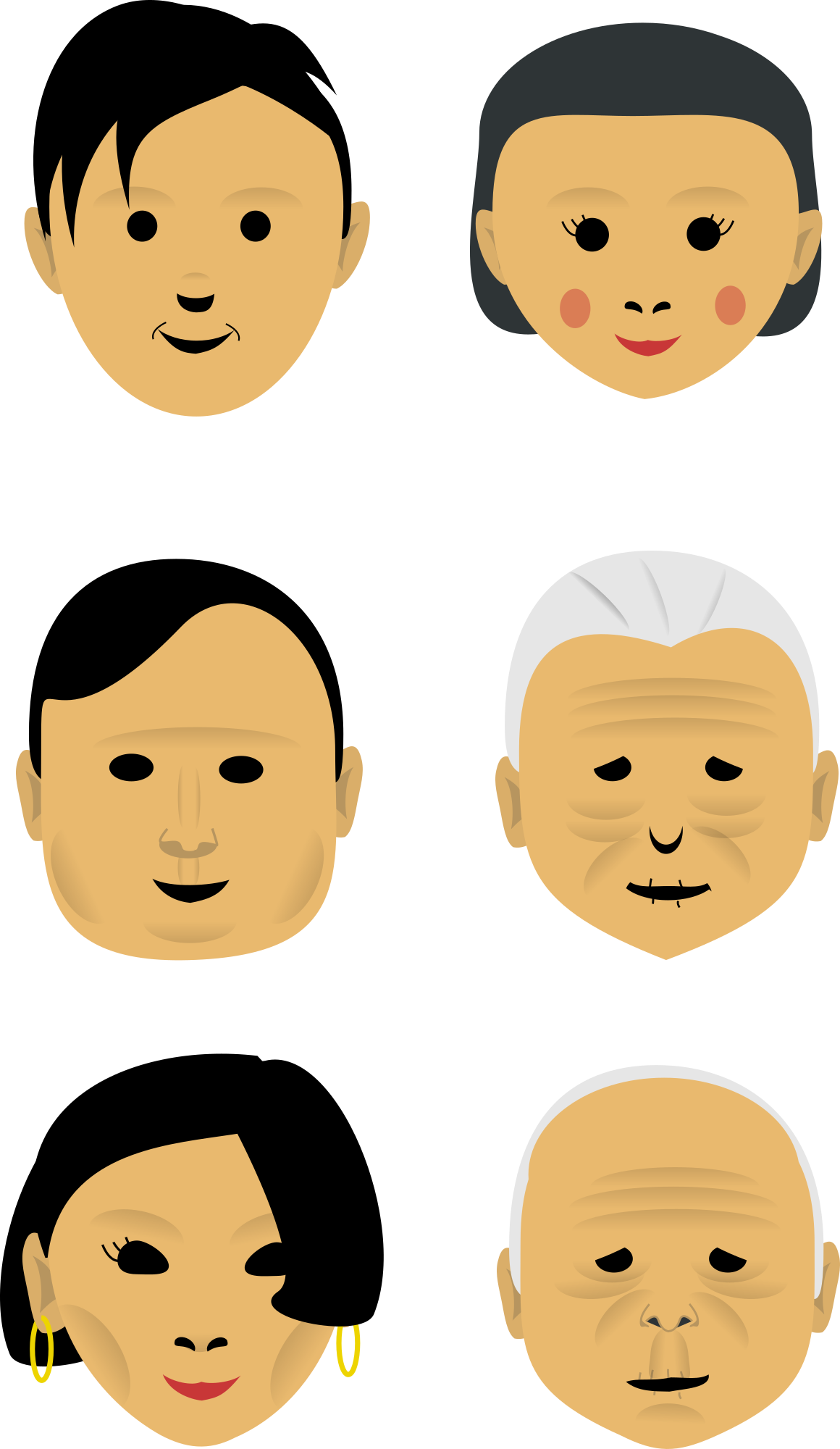Different faces drawed using gradient, dark eyes without details, and no strokes.