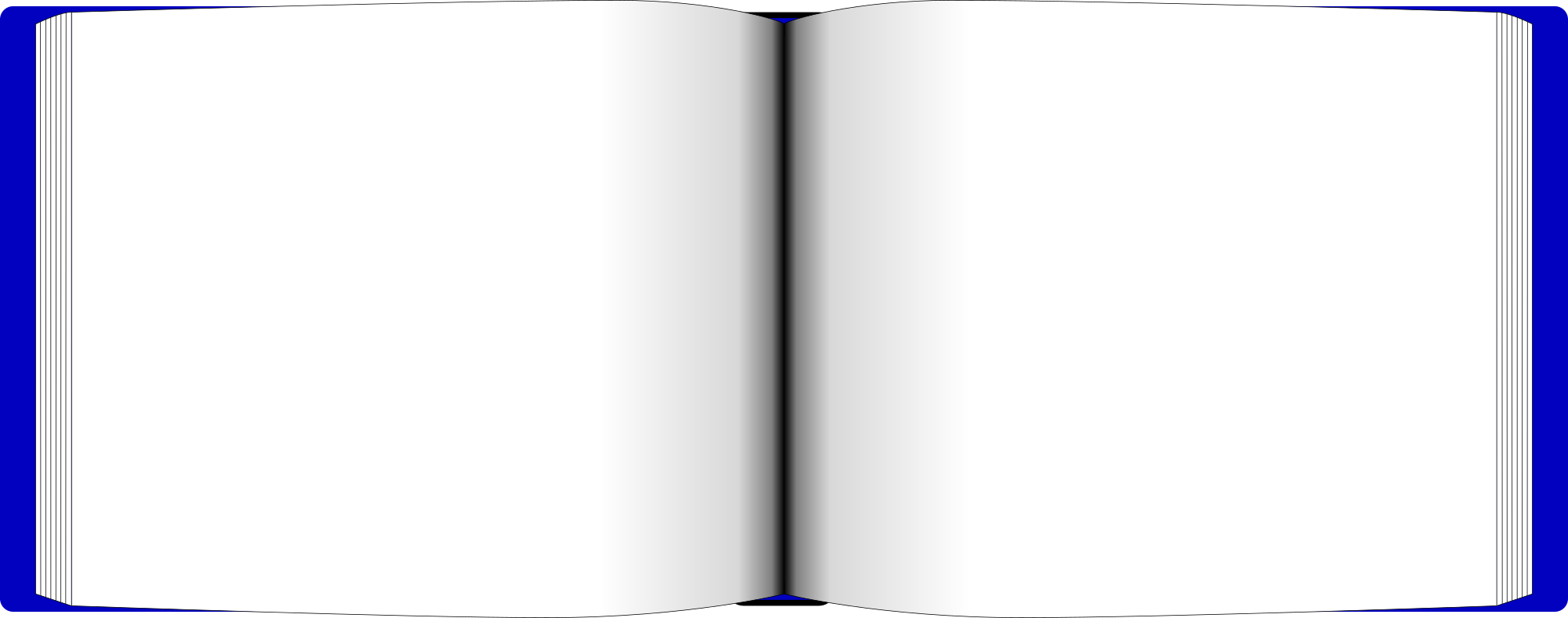 An open-facing book with blank page and a blue cover-jacket.