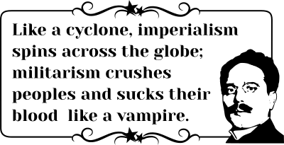 Like a cyclone, imperialism spins across the globe; militarism crushes peoples and sucks their blood like a vampire.