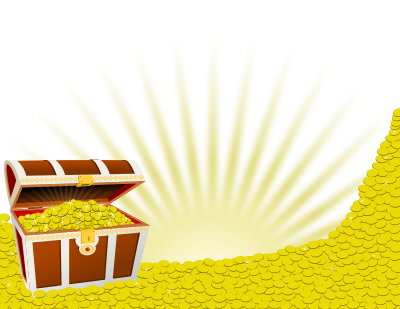 A pile of coins with a treasure chest and a glow behind it. Suitable for the bottom border of a page.