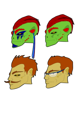 A cartoon reptile head taking a human incognito.