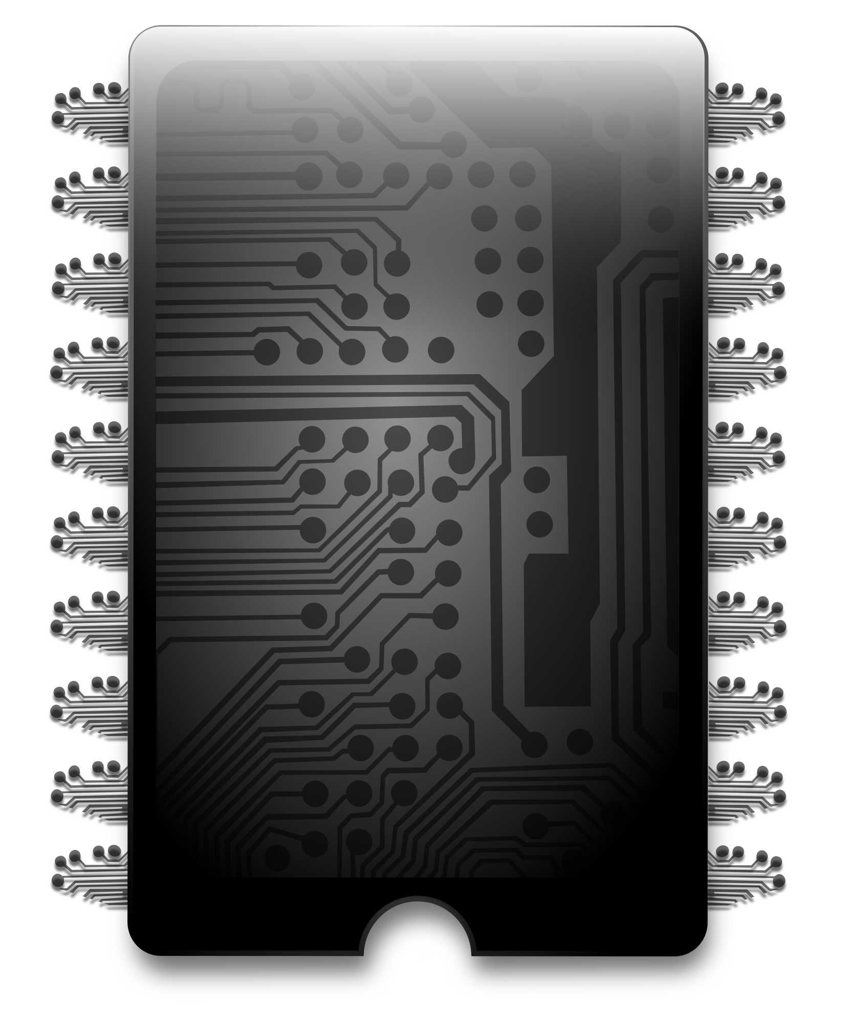 Biochip v10 with a black etched circuit board on the body and pins of the IC. This is a layered image. License: Public Domain