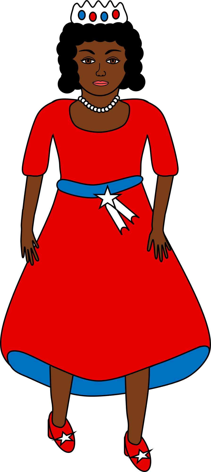 An african-american woman in a red, white, and blue dress, pearls, and heels with stars. All ready for the 4th of july.